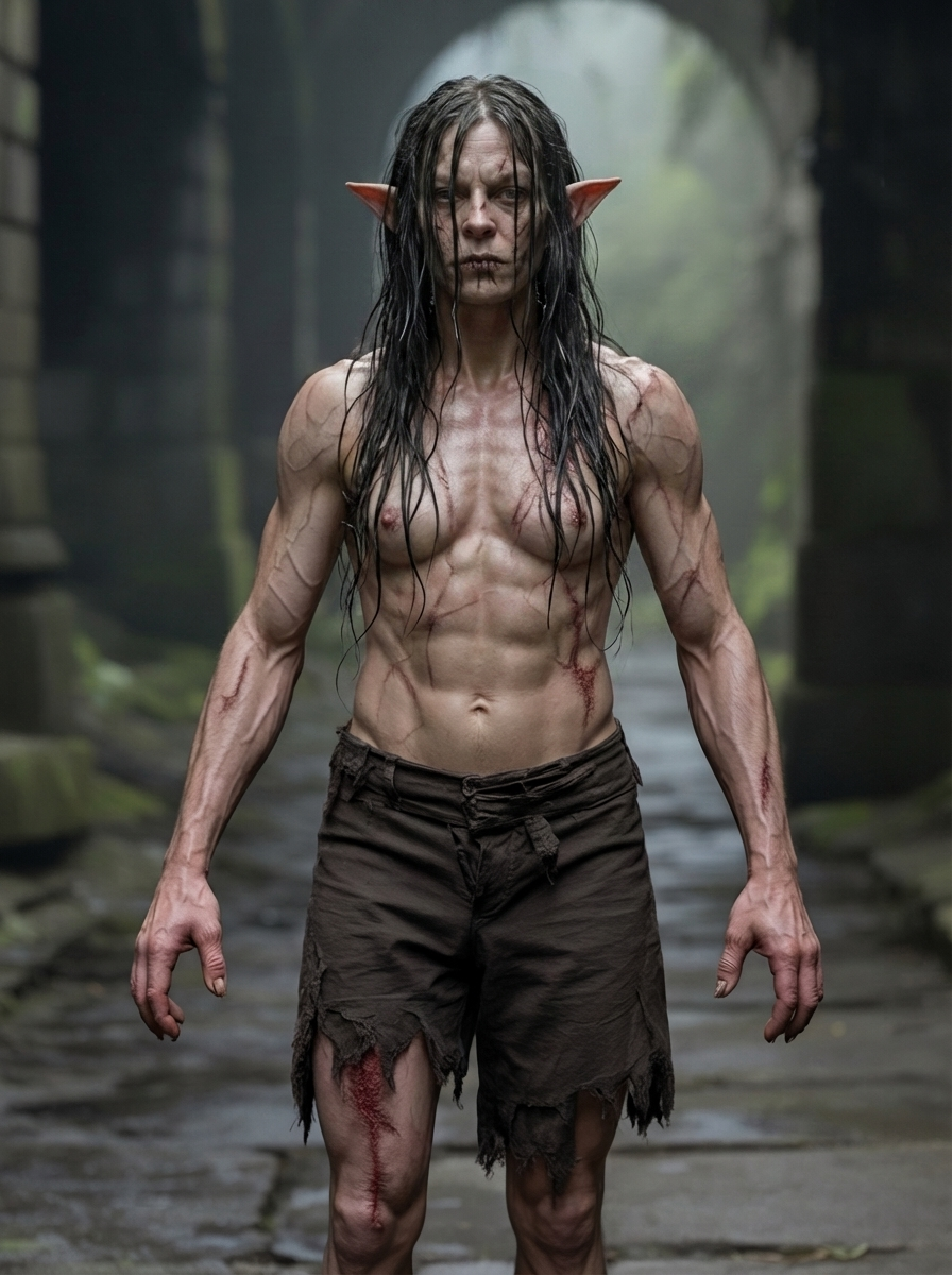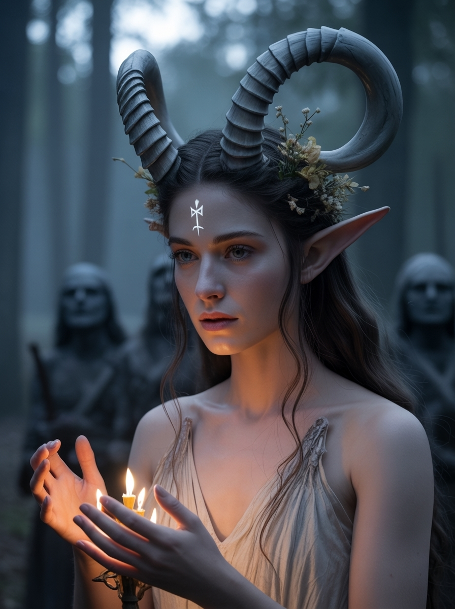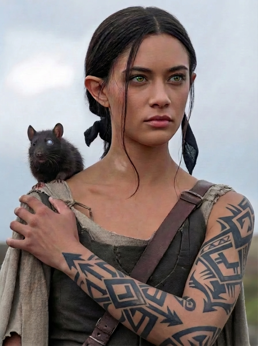 Half-Alvar, so she runs somewhere between the slender Alvar grace of her mother and the more solid human build of her father. Ten years of hard outdoor living with the dwarves has made her lean and capable. Durni clan tattoos cover her left arm from wrist to nearly the shoulder — warrior marks, almost never given to women, earned after her first kill at thirteen. She carries a sickle and a graelin dagger. Plague rides on her shoulder or inside her cloak.