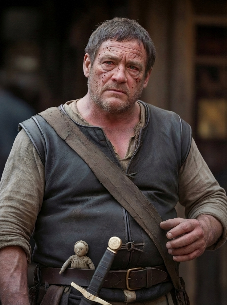 Tucked into his belt every day. His daughter left it behind — or it was left behind for her — when Gladys took her. He has carried it ever since, through every road job, every fight, every year of drifting. It is not attached to his weapon. He would not bring his daughter into the killing. He just keeps her near him. If Mags asks about it, he says it belongs to his daughter. That is all he says.